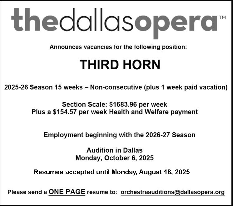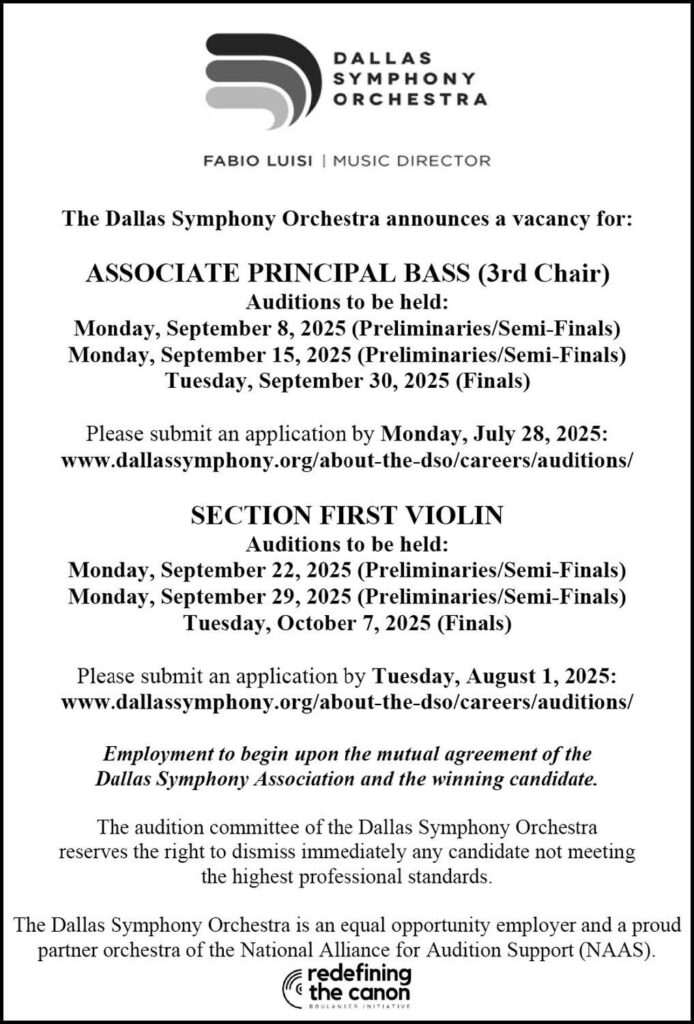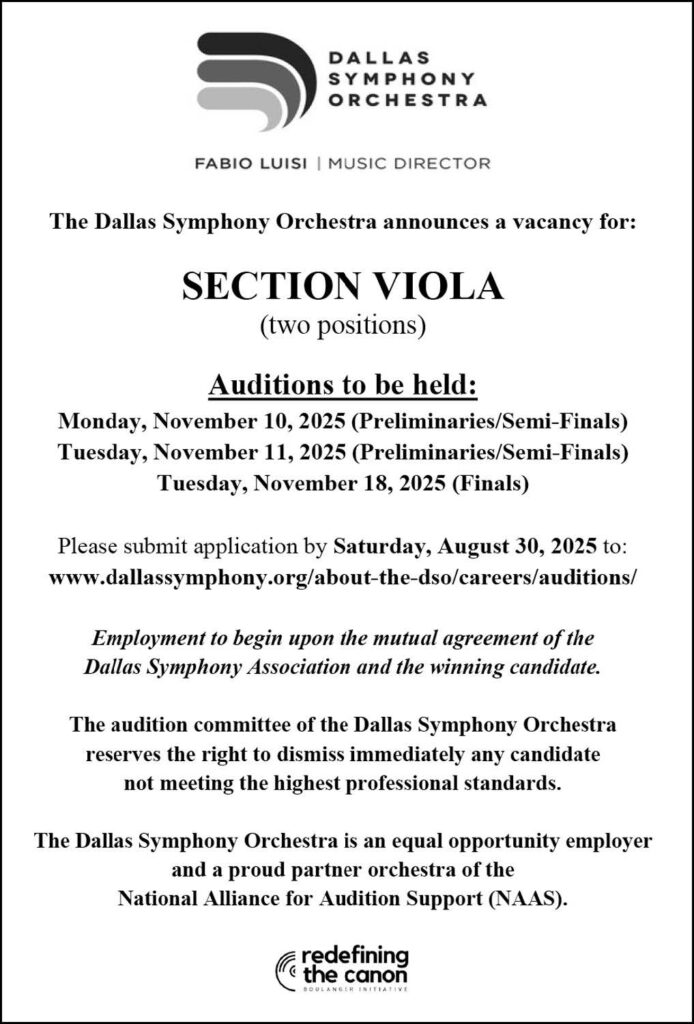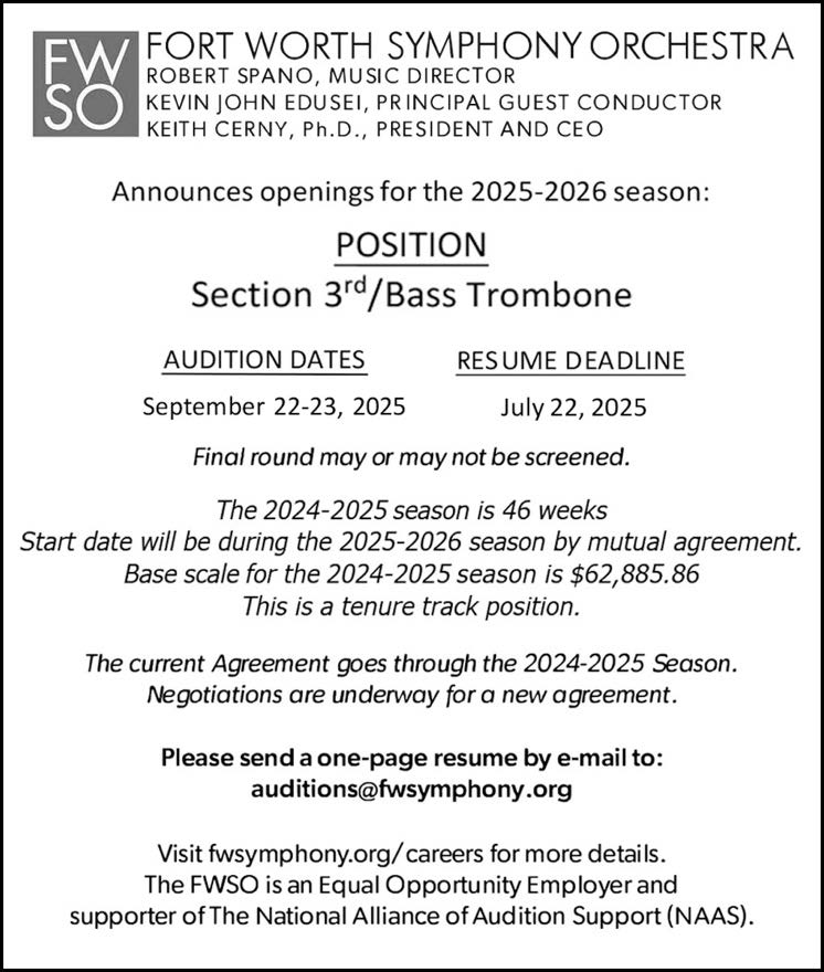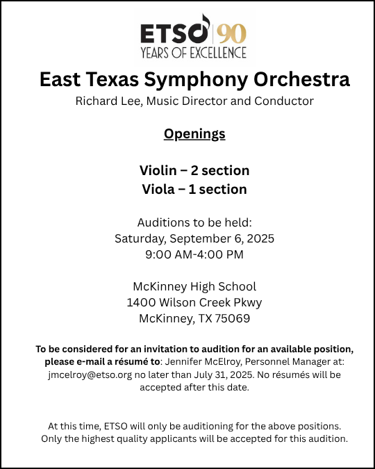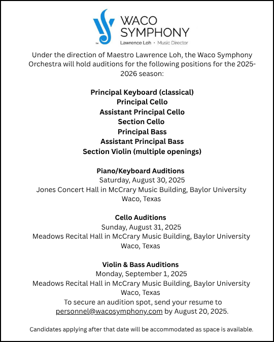 Auditions Waco Symphony Orchestra See Auditions at WSO Website Fort Worth Symphony Orchestra See Audition Information at FWSO Website Dallas Symphony Orchestra See Audition Information at DSO Website Dallas Symphony Orchestra See Audition Information at DSO Website East Texas Symphony Orchestra More Audition Info at ETSO Website Dallas Opera Orchestra See Career Page at The Dallas Opera Website